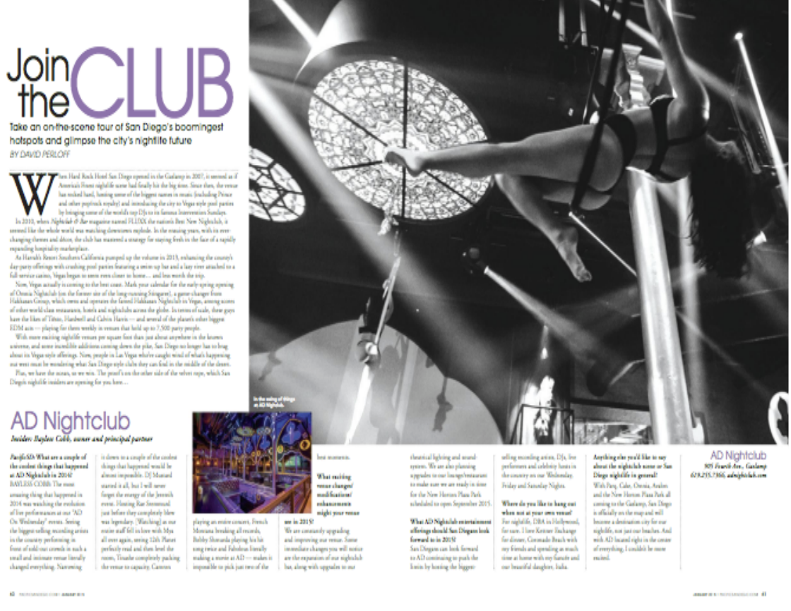 AD Club opened its doors in August 2014 and since then has been offering a full nightclub experience with craft cocktails, synchronized areal theatrics, the latest in music, eleven bottle service booths and a small bites menu. The 4,000 square-foot space is decorated with traditional cathedral and religious elements that give the venue a unique bold and daring design. For those who worship food, exclusive dining “pop-ups” events are hosted with popular chefs who create special prix-fix menus for the occasion. AD Club is a creation of Coronado, California entrepreneurs Bayless Cobb and Giana Loya.
